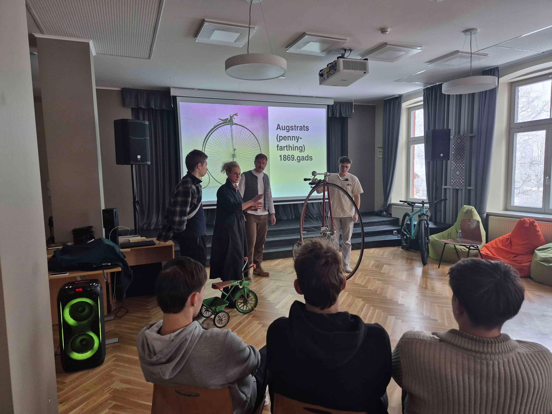 ![]() | Nodarbības laikā muzeja darbinieki demonstrēja, kā Ņūtona likumi darbojas ikdienā, īpaši pievēršoties kustībai, spēkiem un līdzsvaram. Ar dažādu piemēru un praktisku demonstrējumu palīdzību mēs labāk izpratām, kā šie fizikas likumi ietekmē velosipēda kustību un cilvēka braukšanu ar to. Īpaši aizraujoša bija iespēja pašiem izmēģināt braukšanu ar neparastiem velosipēdiem – gan ar ļoti mazu, gan ar ļoti lielu riteni. Lielā velosipēda priekšējā riteņa diametrs sasniedza pat 1,5 metrus, kas ļāva praktiski sajust, kā riteņa izmērs ietekmē kustību un stabilitāti. |