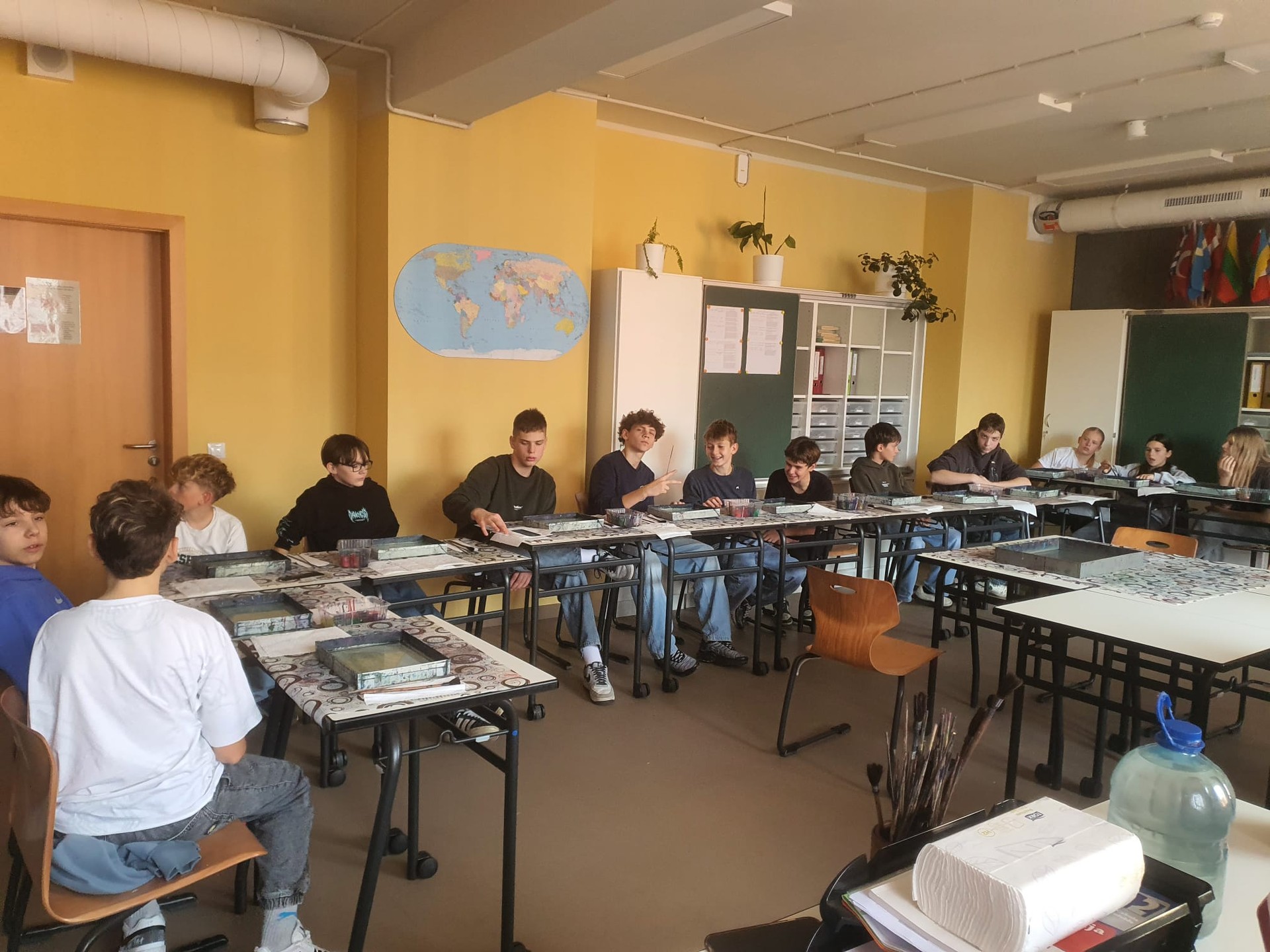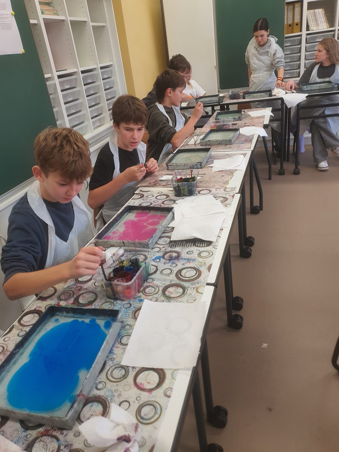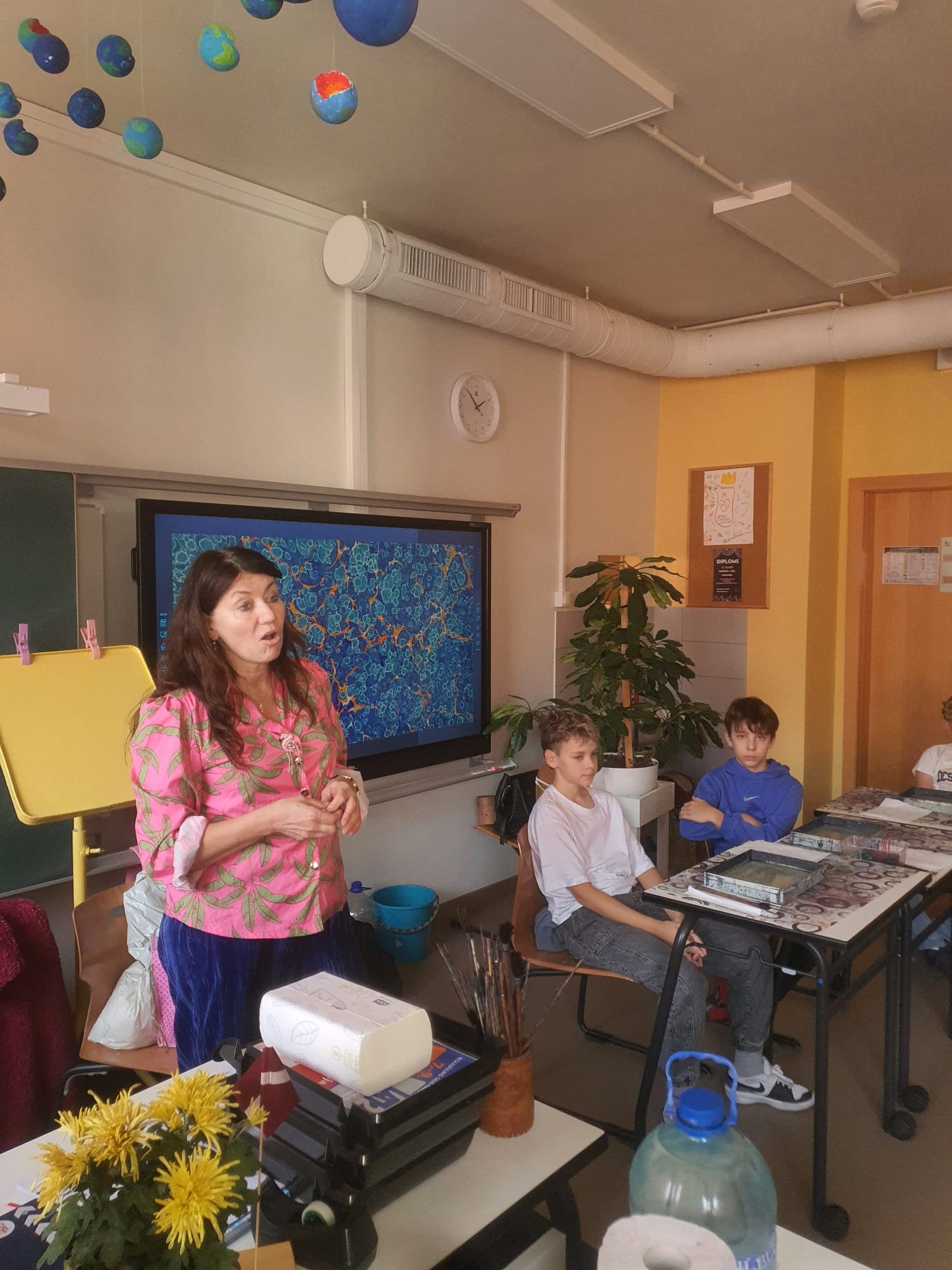 Skolēni ar aizrautību eksperimentēja ar krāsām un formām, veidojot gan abstraktus rakstus, gan ziedu, sirsniņu un viļņu motīvus. Nodarbības noslēgumā viņi savus ebru darbus pārcēla ne tikai uz papīra, bet arī uz T-krekliem, radot oriģinālus un personīgus dizainus.