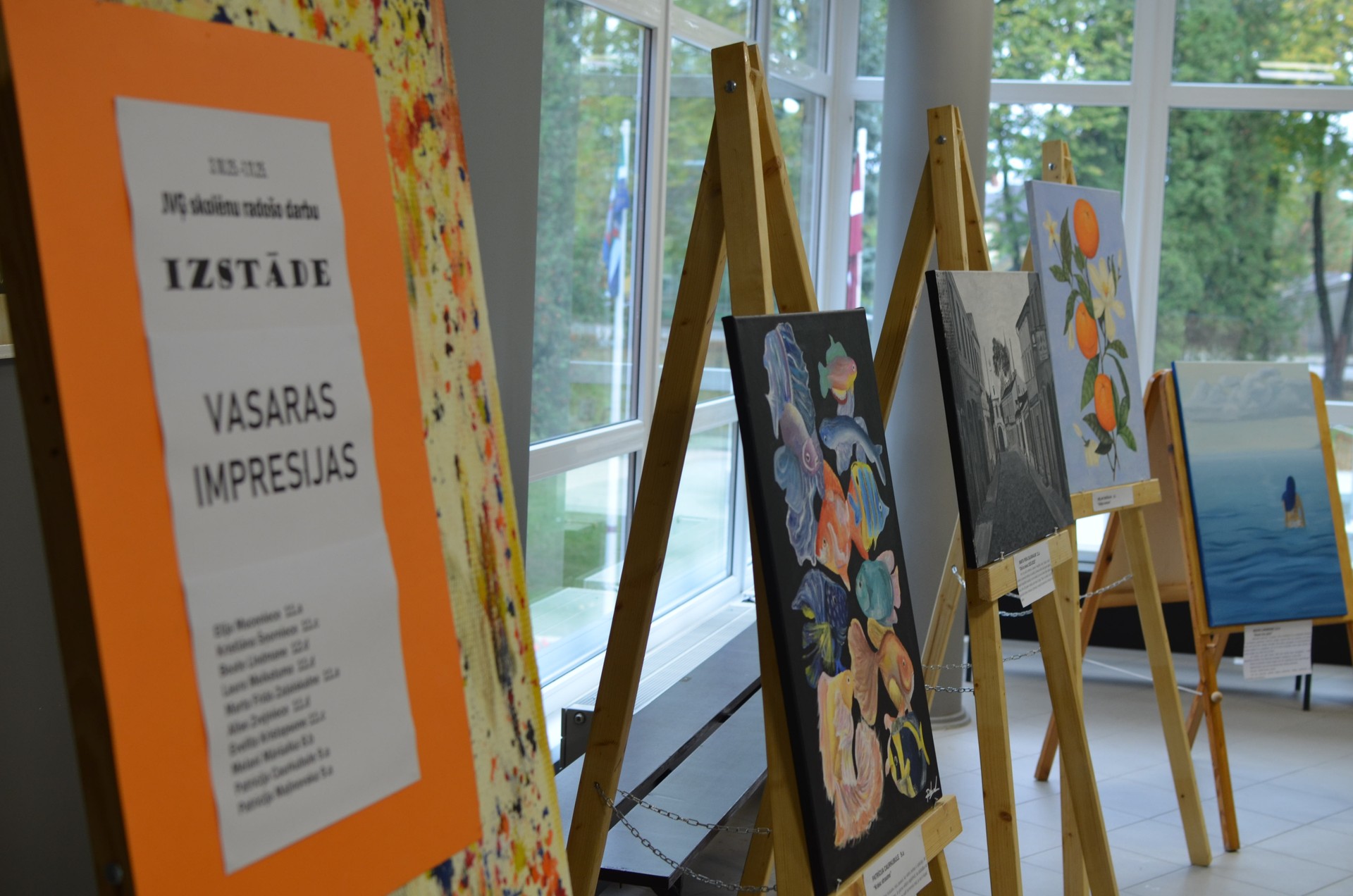 Garajā starpbrīdī tika atklāta skolotājas Elgas Skrebeles audzēkņu izstāde. Desmit darbi – desmit dažādi redzējumi. Desmit skolnieces vasaras periodā saņēma vienāda izmēra audeklus, uz kuriem tiem bija uzdevums attēlot savas vasaras izjūtas. Izstādē “Vasaras impresijas” apskatāmi Elijas Mucenieces (11.a), Kristiānas Šņornieces (11.c), Beates Lindmanes (12.d), Lauras Meikstumas (11.d), Martas Frīdas Zaļaiskalnes (11.a), Alises Zvejnieces (11.d), Evelitas Kristapsones (11.c), Melanī Māršalkas (8.b), Patrīcijas Caurkubules (9.a), Patrīcijas Maļinovskas ( 9.a) radošie darbi. | ||