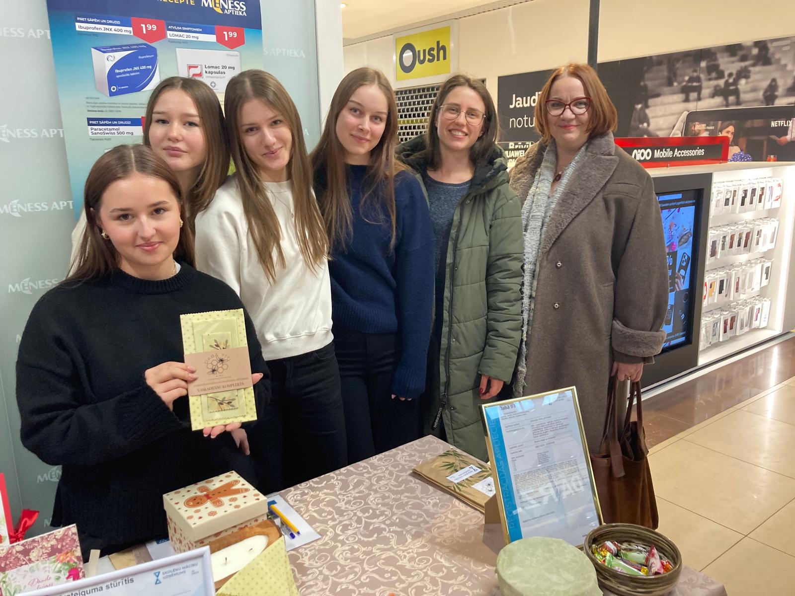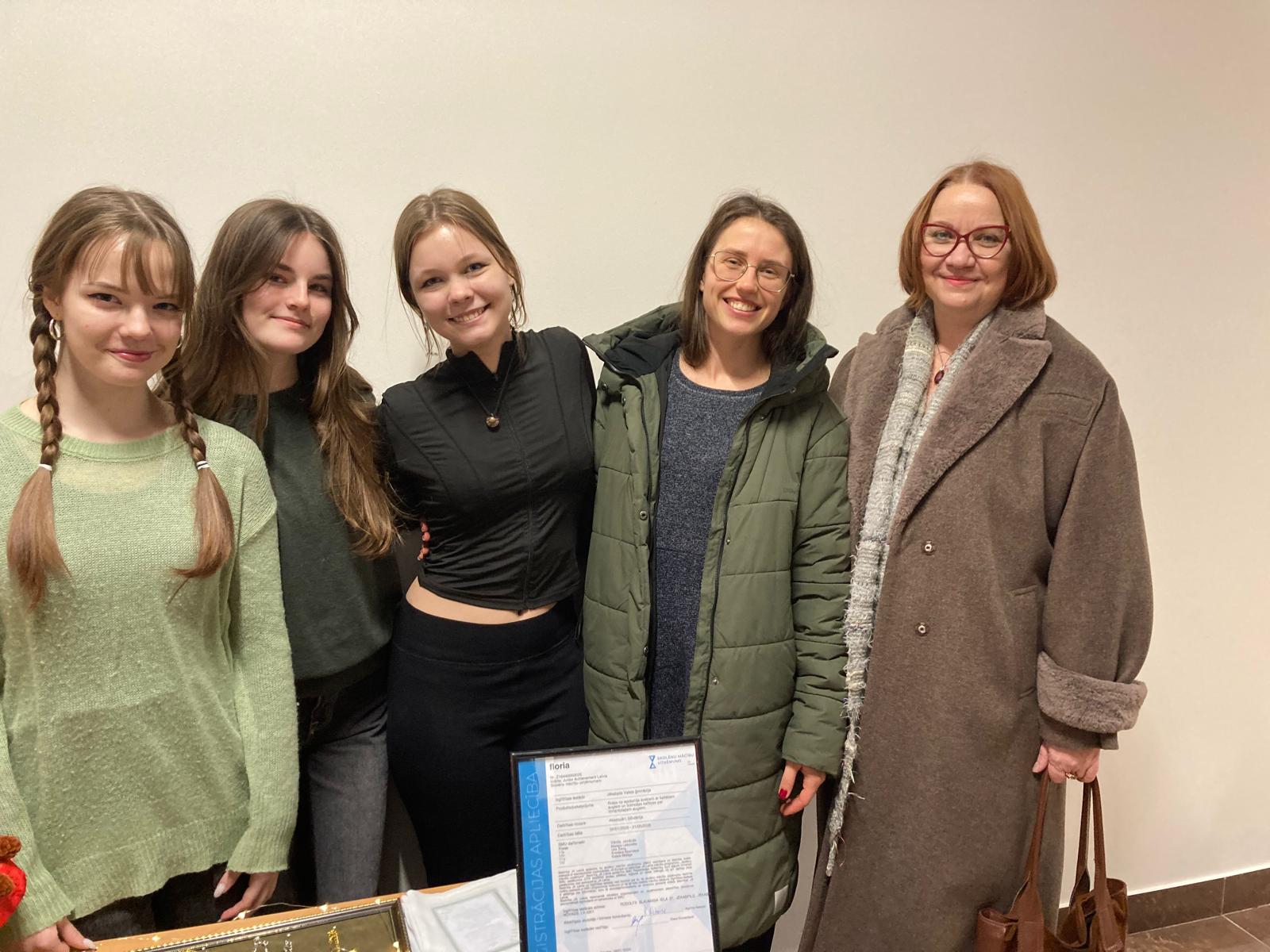 11.c un 11.b klases skolnieces Madara Latkovska, Una Žeica, Kristiāna Šņorniece, Estere Midega pārstāv uzņēmumu “FLORIA”, kas ražo rotas no epoksīda sveķiem ar kaltētiem augiem, klāt pievienojot izzinošas kartītes par izmantotajiem augiem.