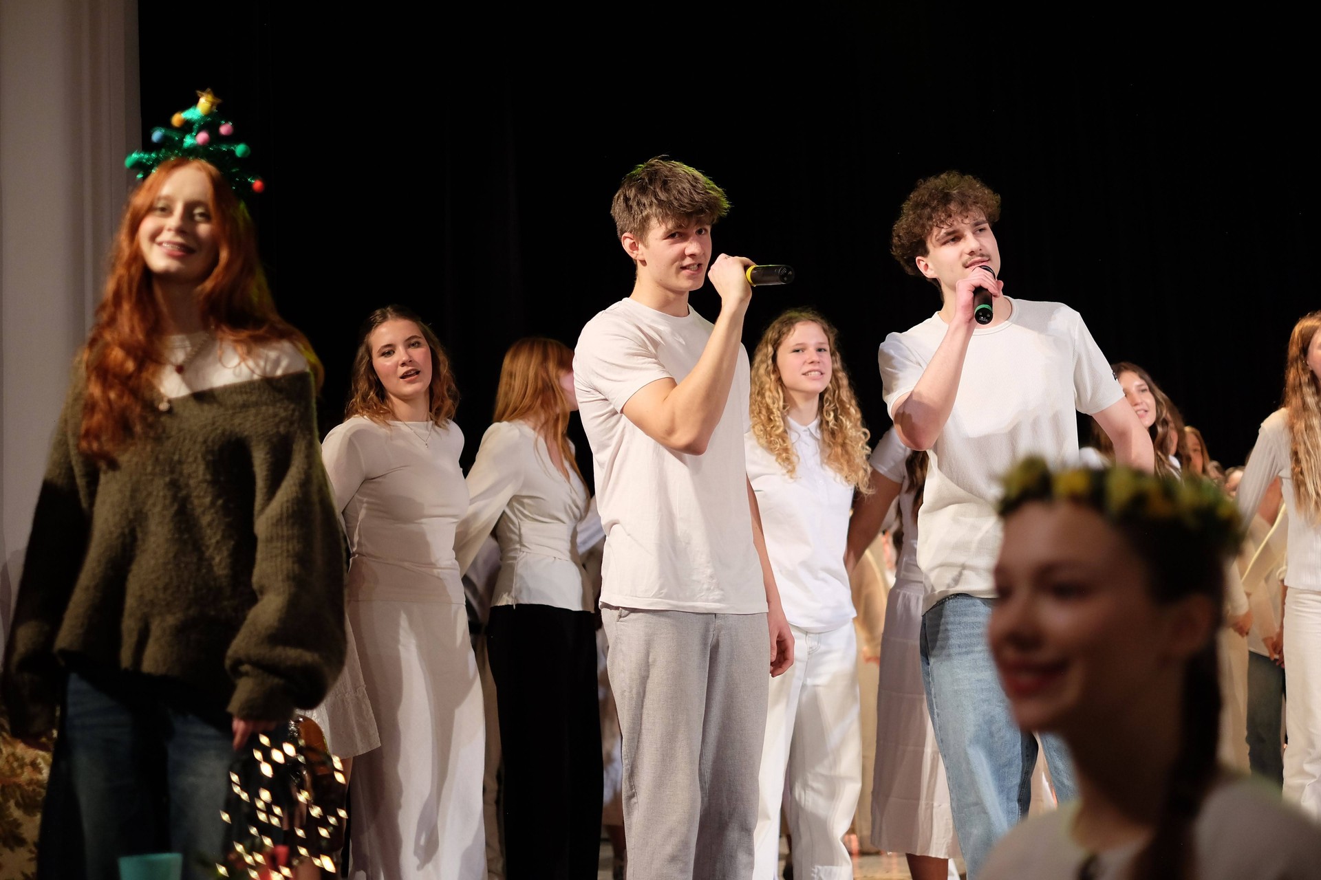 Decembris ir īpašs ar to, ka ne tikai gaidām semestra noslēgumu un starpvērtējumu izlikšanu, bet arī ļaujamies skaistajam Ziemassvētku gaidīšanas laikam. Šogad kopā rotājām skolas eglīti, organizējām Ziemassvētku pastu un gatavojāmies svētku koncertam. 19. decembrī visi skolas skolēni un skolotāji tikāmies krāšņā un sirsnīgā Ziemassvētku koncertā Krustpils kultūras centrā “Vieni paši mājās!”. Šogad ar dejām mūs priecēja Ingrīdas Feldmanes vadītais skolas deju kolektīvs “Kauranieši”, kuriem pievienojās arī deju kolektīvs “Pastalnieki”, jo tajā dejo ļoti daudz ģimnāzijas jauniešu, savukārt ar dziesmām mūs priecēja Sandra Bondare un koris “Ritums”, skolas muzikālie jaunieši un Rolanda Rubiķa vadītais ģitāristu ansamblis, kā arī grupa “Zaros” . Pasākuma vadītāju lomās iejutās 7. klases skolēns Rūdolfs Pusbarnieks un 12. klases skolniece Sofija Komarova. Mazais brālis ar māsu, palikuši vieni mājās, meklē svētku sajūtu, kamēr gaida vecākus atgriežamies no lidostas. Kā pietrūkst šajā klasiskajā stāstā? Kāda, kas varētu svētkus izjaukt! Svētku zagļu lomā iejutās 7. klases skolēns Ričards Bīrīts un 12. klases skolēni Rihards Lomanovs un Matīss Dzirkalis. Liels prieks, ka šādi var sadarboties skolas jaunākie skolēni ar topošajiem absolventiem! Zagļiem svētkus neizdevās izbojāt, jo palīgā nāca skolotāji, kas arī bija sagatavojuši sirsnīgu priekšnesumu!
