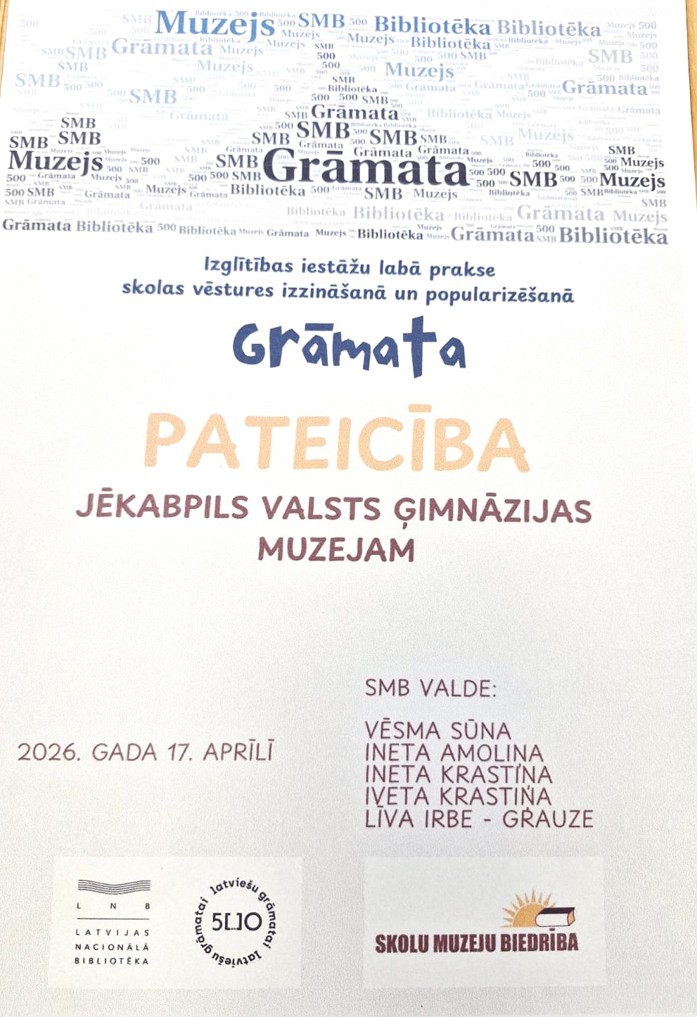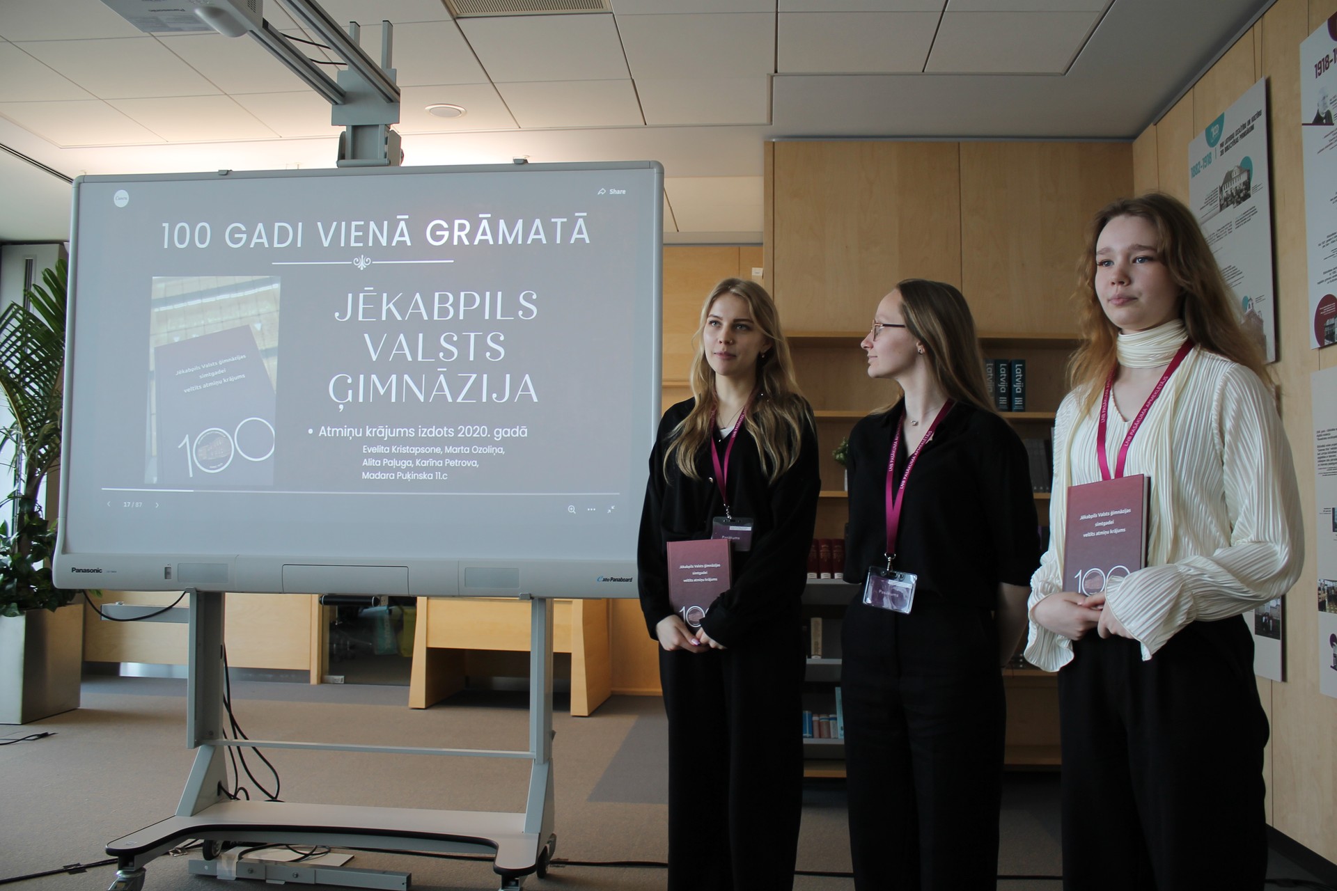 ![]() | 2026. gada 17. aprīlī Skolu muzeju biedrības organizētajā pasākumā Latvijas Nacionālajā bibliotēkā (LNB) tika uzņemti pārstāvji no 22 Latvijas skolām. Viņiem bija unikāla iespēja prezentēt savus pētījumus vienā no mūsu valsts nozīmīgākajiem kultūras centriem. Šī vide piešķīra pasākumam īpašu svētku sajūtu un papildu motivāciju jaunajiem pētniekiem. Šajā mācību gadā ģimnāzijas muzejs ir atjaunojis savu darbību skolu muzeju biedrībā. Pasākums “Grāmata” (izglītības iestāžu vēstures izzināšanas un popularizēšanas labā prakse) tika rīkots ciklā “Latviešu grāmatai 500” . |