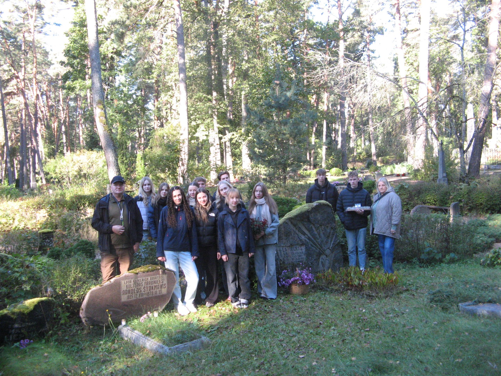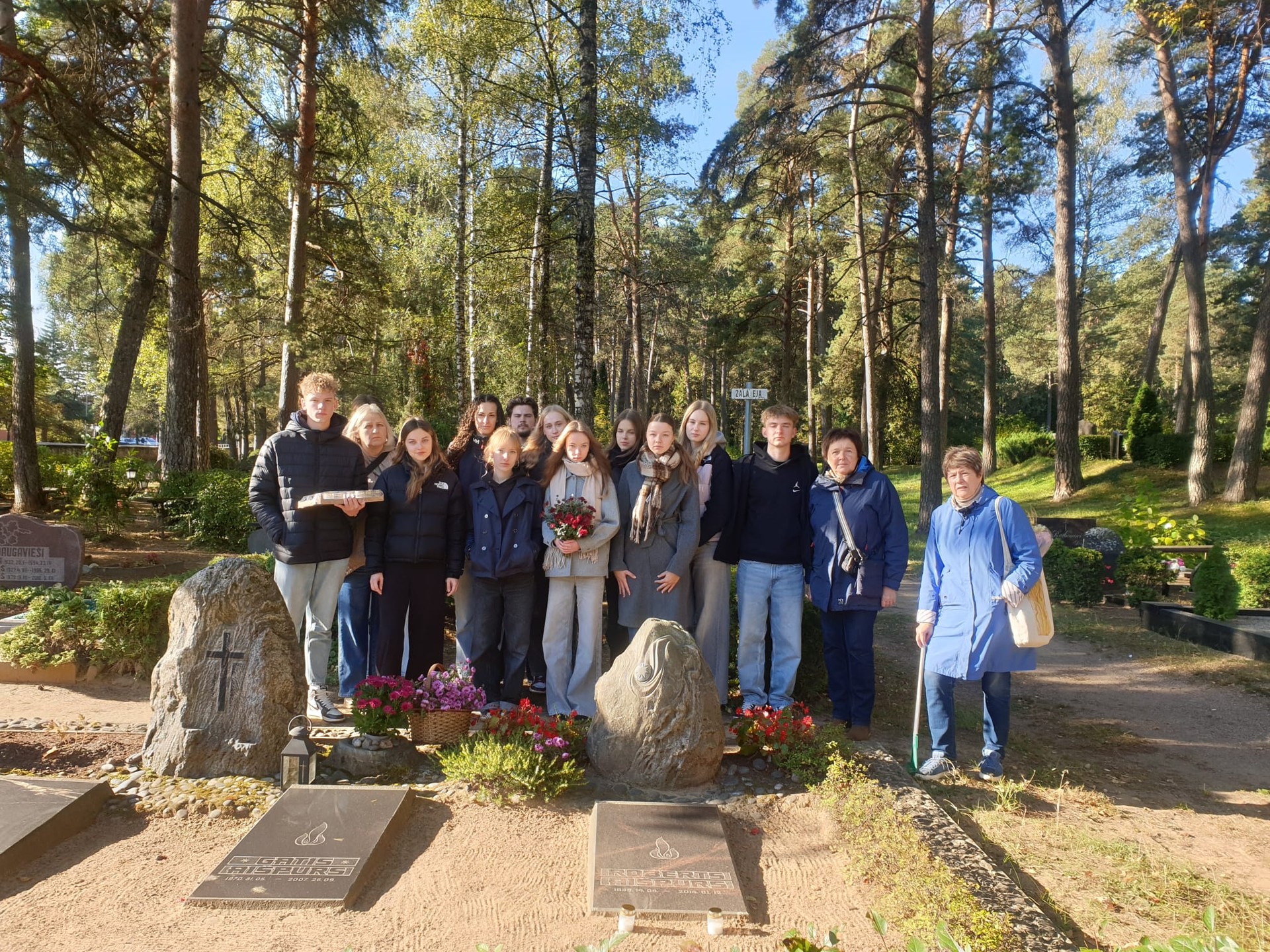 ![]() | Šajā mācību gadā 12.c klase un audzinātāja Ingrīda Feldmane (skolas 1983. gada absolvente) turpināja tradīciju, īsi pirms skolas dzimšanas dienas apmeklējot Jēkabpils kapus un uzzinot par cilvēkiem, kas bijuši saistīti ar skolu. Šajā reizē kopā ar mums pasākumā piedalījās skolotāja Anita Vītola (skolas 1972. gada absolvente) un novadpētnieks Jānis Zeps. A. Vītola sniedza lielu atbalstu kapavietu apzināšanā un maršruta izstrādāšanā. Kā teica ģimnāzisti, bija interesanti dzirdēt atmiņu stāstus, iepazīt kultūrvēsturisko mantojumu, apskatot kapavietas. Godinot bijušos skolas darbiniekus un pedagogus, skolēni un audzinātāja bija sarūpējuši rudens ziedus un sveces. | |